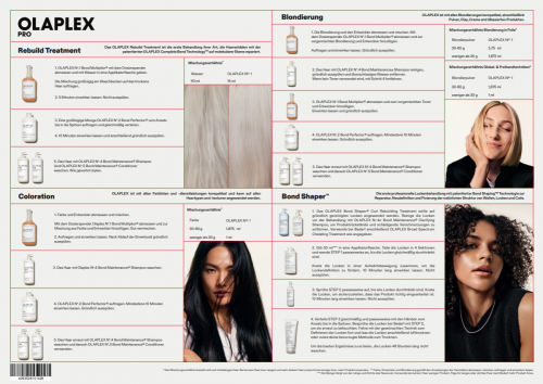 Das OLAPLEX Backbar Poster ist das perfekte Tool für jeden Salon, der mit OLAPLEX arbeitet. Es zeigt die vier gängigsten Anwendungen übersichtlich und leicht verständlich – ideal zur schnellen Orientierung direkt am Platz: