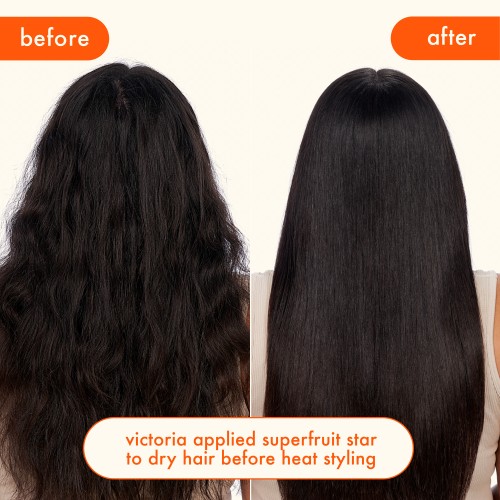 Avant le coiffage à la chaleur, appliquez 1 à 2 pressions sur cheveux humides ou secs pour renforcer et protéger contre les dommages thermiques. Pour lisser et apporter de la brillance à la coiffure terminée, appliquez 1 à 2 pressions sur cheveux secs, en insistant sur les pointes. Astuces professionnelles : la formule est suffisamment légère pour conserver le volume tout en apportant force et éclat. Superfruit Star offre une protection et une douceur supplémentaires avant la coupe.